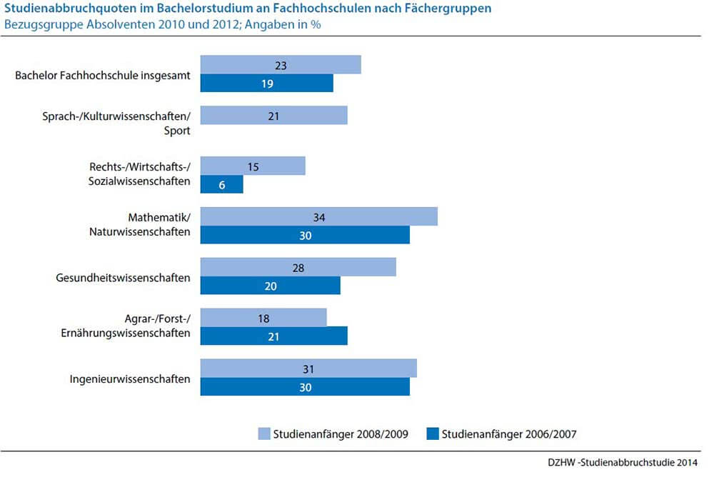 An den Fachhochschulen ist die Quote derer, die ihr Studium abbrechen zwar generell geringer, aber auch hier gibt es auf die Fächergruppen gesehen eine ähnliche Verteilung wie an den Universitäten. Das Studium abbrechen: Die Entscheidung dafür fällt am häufigsten in Universitäten am häufigsten bei Studierenden der Ingenieurswissenschaften und am seltensten in Rechts-/Wirtschafts- und Sozialwissenschaften. In Fachhochschulen fallen die Quoten derer, die ihr Studium abbrechen ähnlich aus.